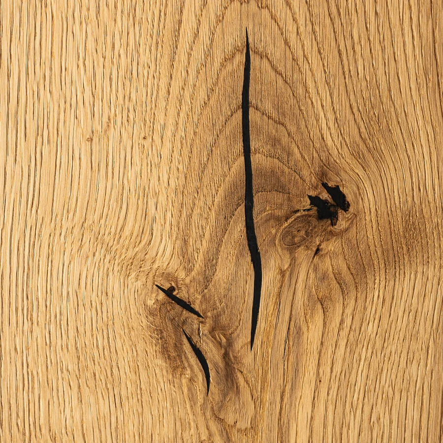 Tmelí se nejen přirozené suky a praskliny, ale v případě potřeby, když dřevo obsahuje „vad“ málo, je možné narušením povrchu pomocí nástrojů vytvořit praskliny nové a tím dosáhnout ještě více rustikálního vzhledu celé podlahy.
